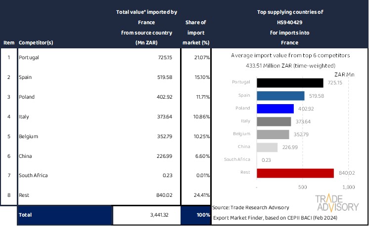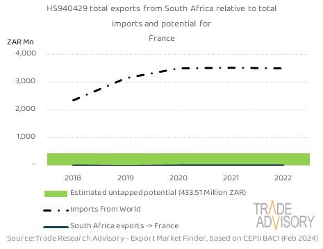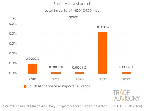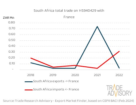 This report contains a summary snapshot of outcomes for the exports of HS940429 to France from the perspective of the home market (South Africa). More technical detail is available on request from Trade Research Advisory.