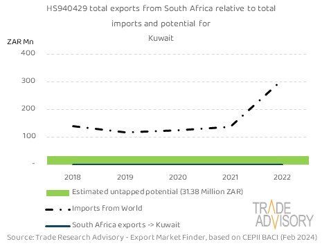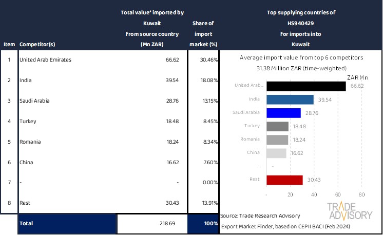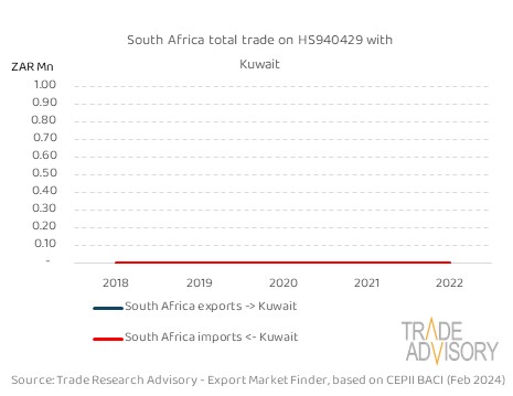 This report contains a summary snapshot of outcomes for the exports of HS940429 to Kuwait from the perspective of the home market (South Africa). More technical detail is available on request from Trade Research Advisory.