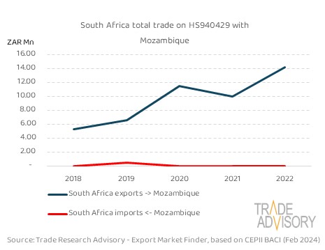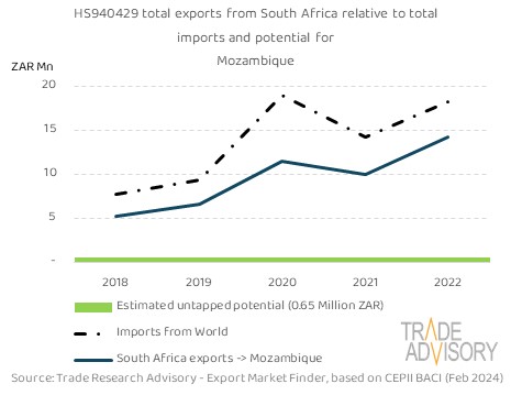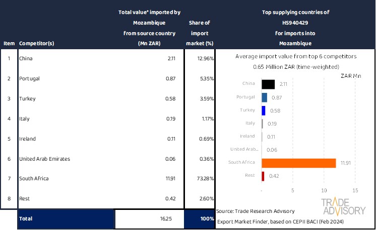 This report contains a summary snapshot of outcomes for the exports of HS940429 to Mozambique from the perspective of the home market (South Africa). More technical detail is available on request from Trade Research Advisory.