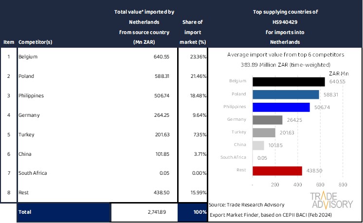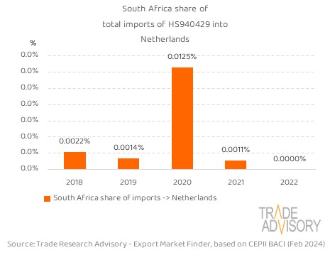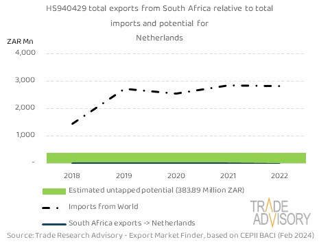 This report contains a summary snapshot of outcomes for the exports of HS940429 to Netherlands from the perspective of the home market (South Africa). More technical detail is available on request from Trade Research Advisory.