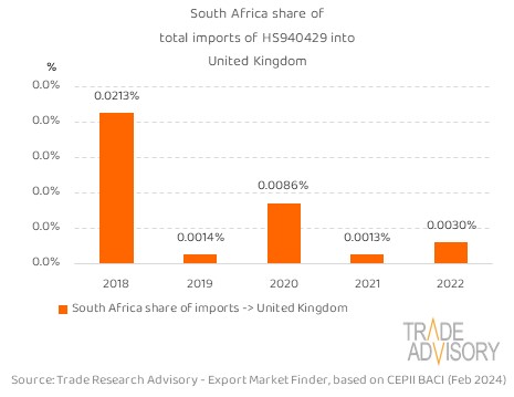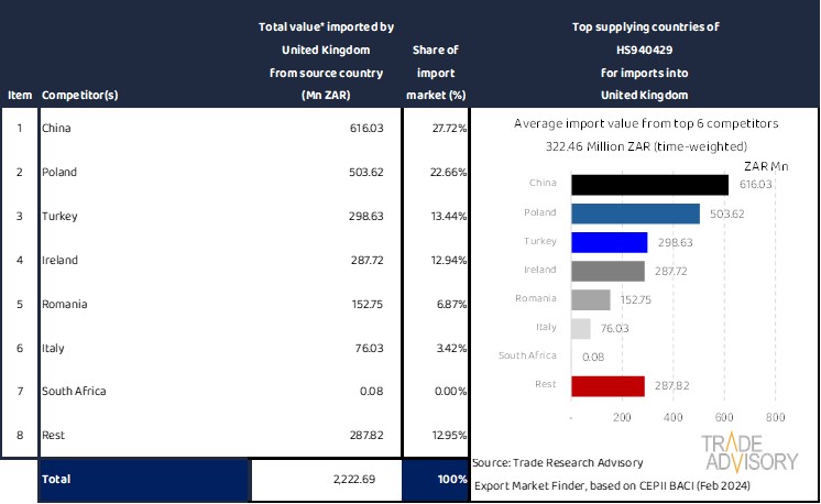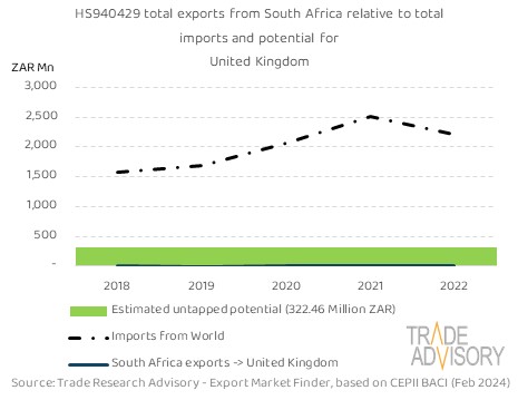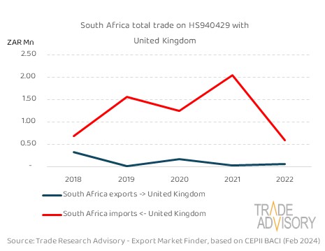 This report contains a summary snapshot of outcomes for the exports of HS940429 to United Kingdom from the perspective of the home market (South Africa). More technical detail is available on request from Trade Research Advisory.