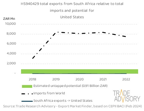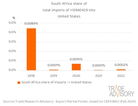This report contains a summary snapshot of outcomes for the exports of HS940429 to United States from the perspective of the home market (South Africa). More technical detail is available on request from Trade Research Advisory.