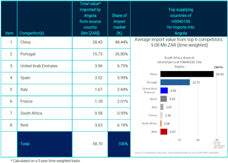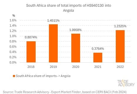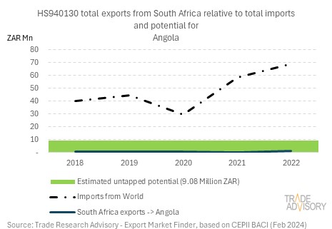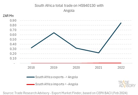 This report contains a summary snapshot of outcomes for the exports of HS940130 to Angola from the perspective of the home market (South Africa). More technical detail is available on request from Trade Research Advisory.